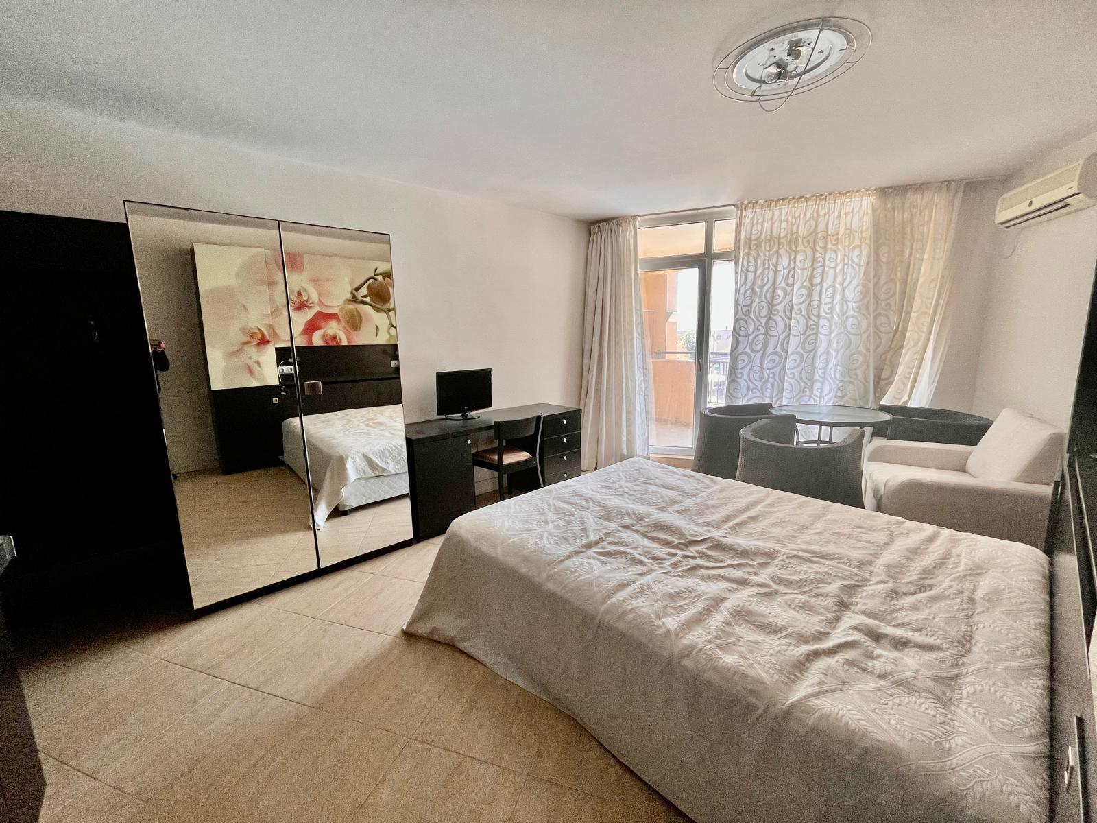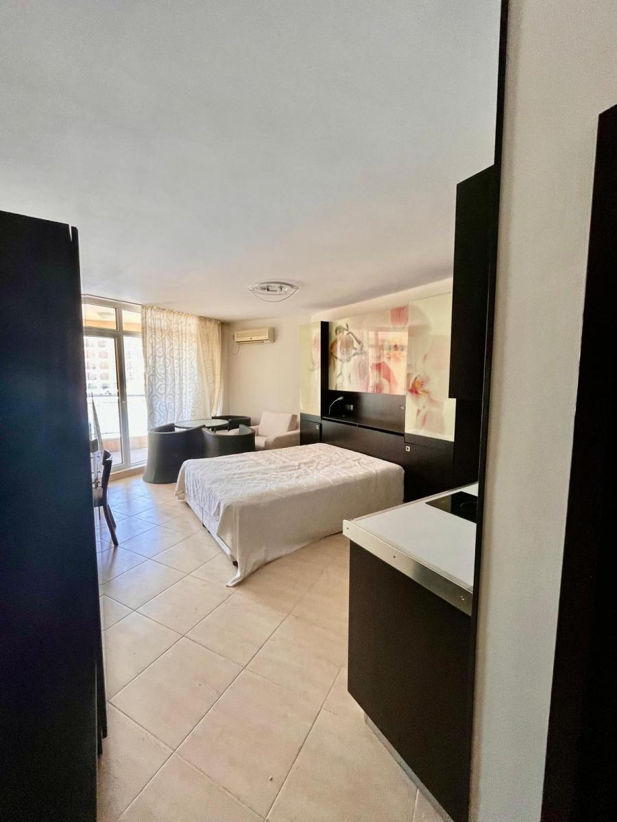 For your attention, we offer for sale a first-line one-bedroom studio for sale on the coast of the Black Sea. The apartment is located on the second floor of the Media Grant Resort complex, Aheloy. The area of the apartment is 49 sq. m with one bedroom and one bathroom and toilet in one. For sale with modern furniture. The terrace is big and have amazing view to see and swimming pool.