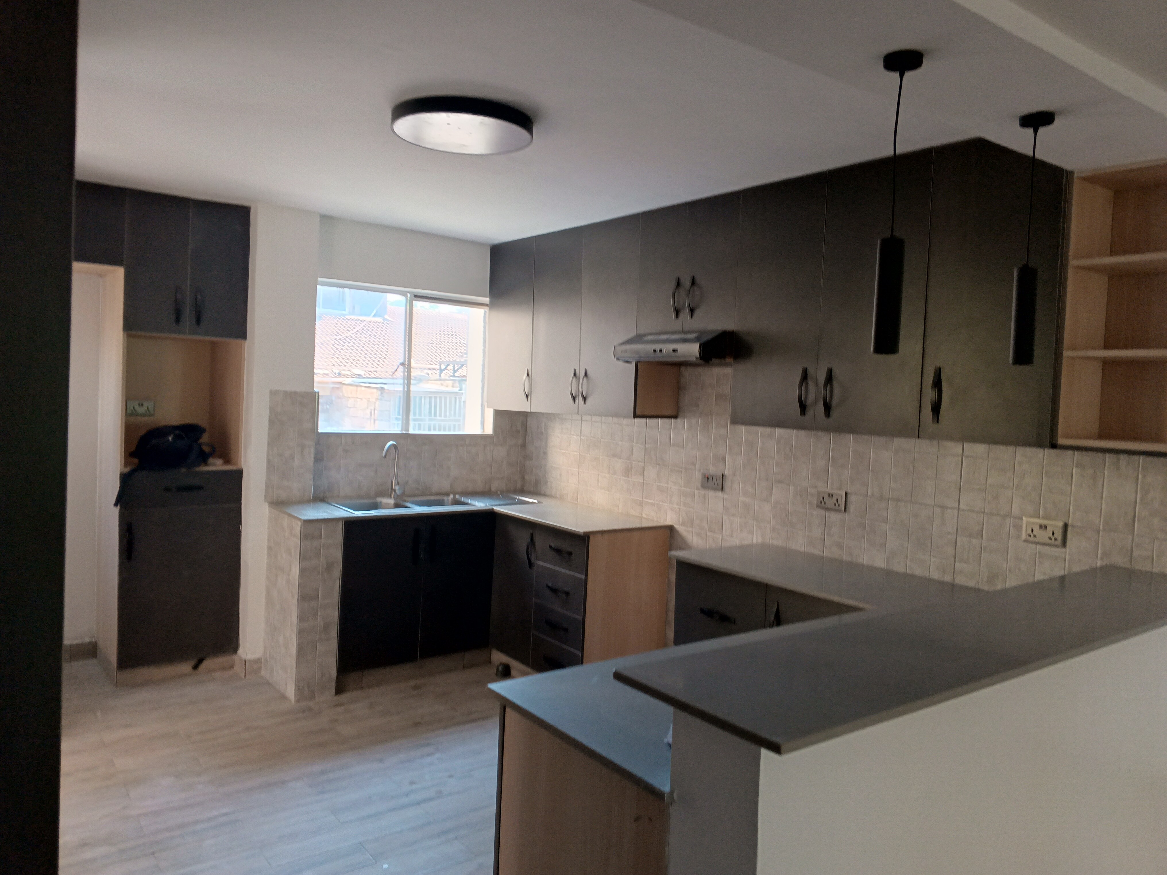 Open kitchen with an adjacent pantry.