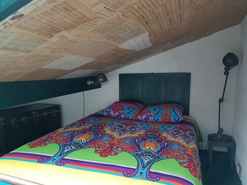 The bedroom is duplex and has a large bed.