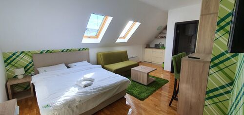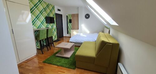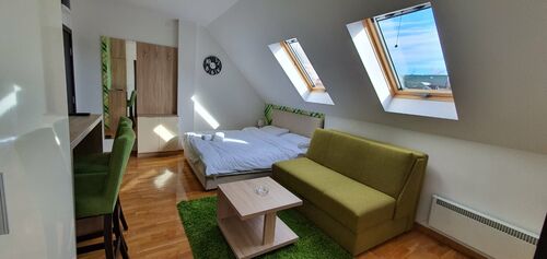 In a quiet location without crowds and noise. A 15-minute easy walk to the center. The complex has everything. A la carte restaurant, Spa and Wellness, swimming pools, children's playgrounds, congress halls, parking with a ramp, heated walkways in the complex and much more. The apartment is suitable and can be rented out through the reception of the Zlatibor Konak, or through any other agency or in person. For any additional information, feel free to call and ask.