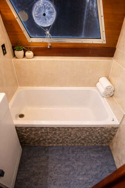 Despite her manageable size, Athos offers an impressive amount of living space, with accommodation that flows well and provides comfortable living whether used as a permanent residence or a weekend retreat. She also retains the ability to cruise the UK’s inland waterways if desired.
