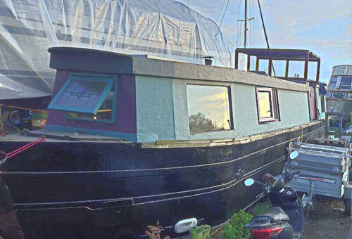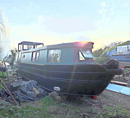 Premier Houseboats are pleased to present Wolfie, a charming and unusual narrowboat project currently on hard standing, offering an excellent opportunity to complete a comfortable and distinctive floating home.