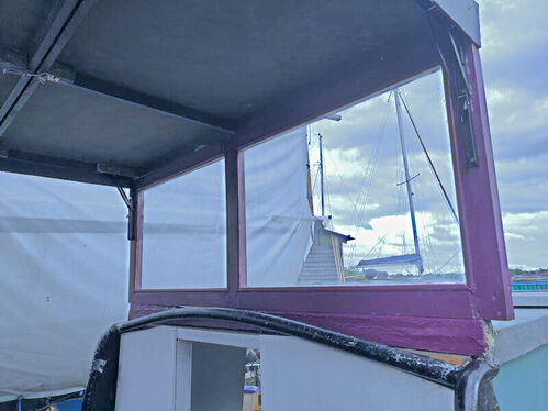 One of Wolfie’s standout features is her collapsible wheelhouse, located about a third of the way down the boat. This versatile feature provides both a sheltered navigation area and the potential to create separate living and sleeping spaces — a rare feature for a vessel of this size.