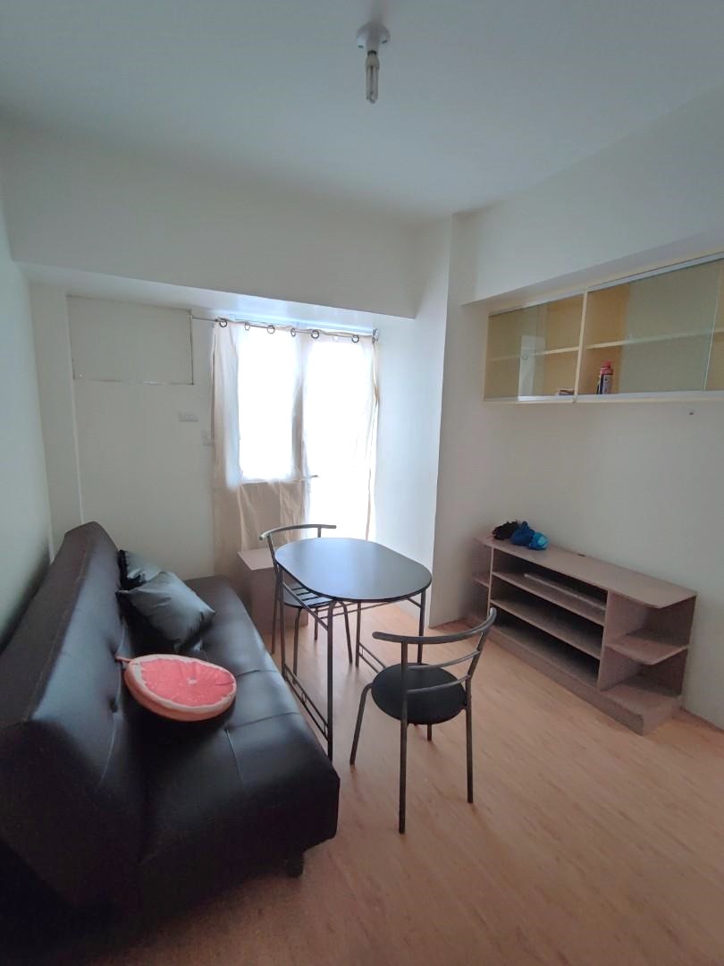 1 Bedroom. Floor Area: 28 sqm. Fully Furnished near elevator with refrigerator, induction cooker, aircon, dining table with 2 chairs, built in kitchen cabinet with glass door, built in book shelves with sliding glass door, granite kitchen countertop, aluminum kitchen cabinet, sofa bed with table, double bed with pull out, built in study table with lamps, built in cabinet, dress closet with drawers, shower enclosure, built in CR Cabinet with sliding glass door