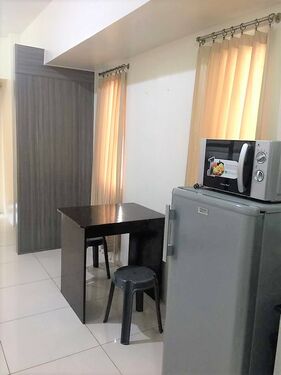 Corner Studio Unit with Balcony overlooking Manila Bay. Floor Area: 35 sqm.Fully Furnished with refrigerator, microwave oven, electric stove, kitchen utensils, shower heater, split type aircon. What is not provided are beds and mattresses. We can furnish bed and sheets according to the requirement of renter.