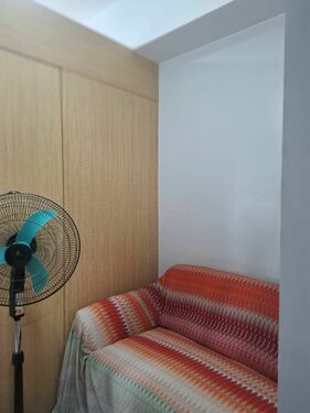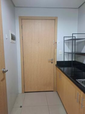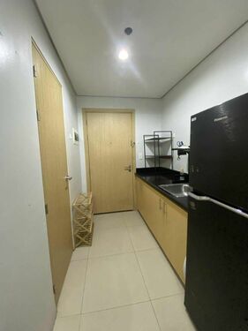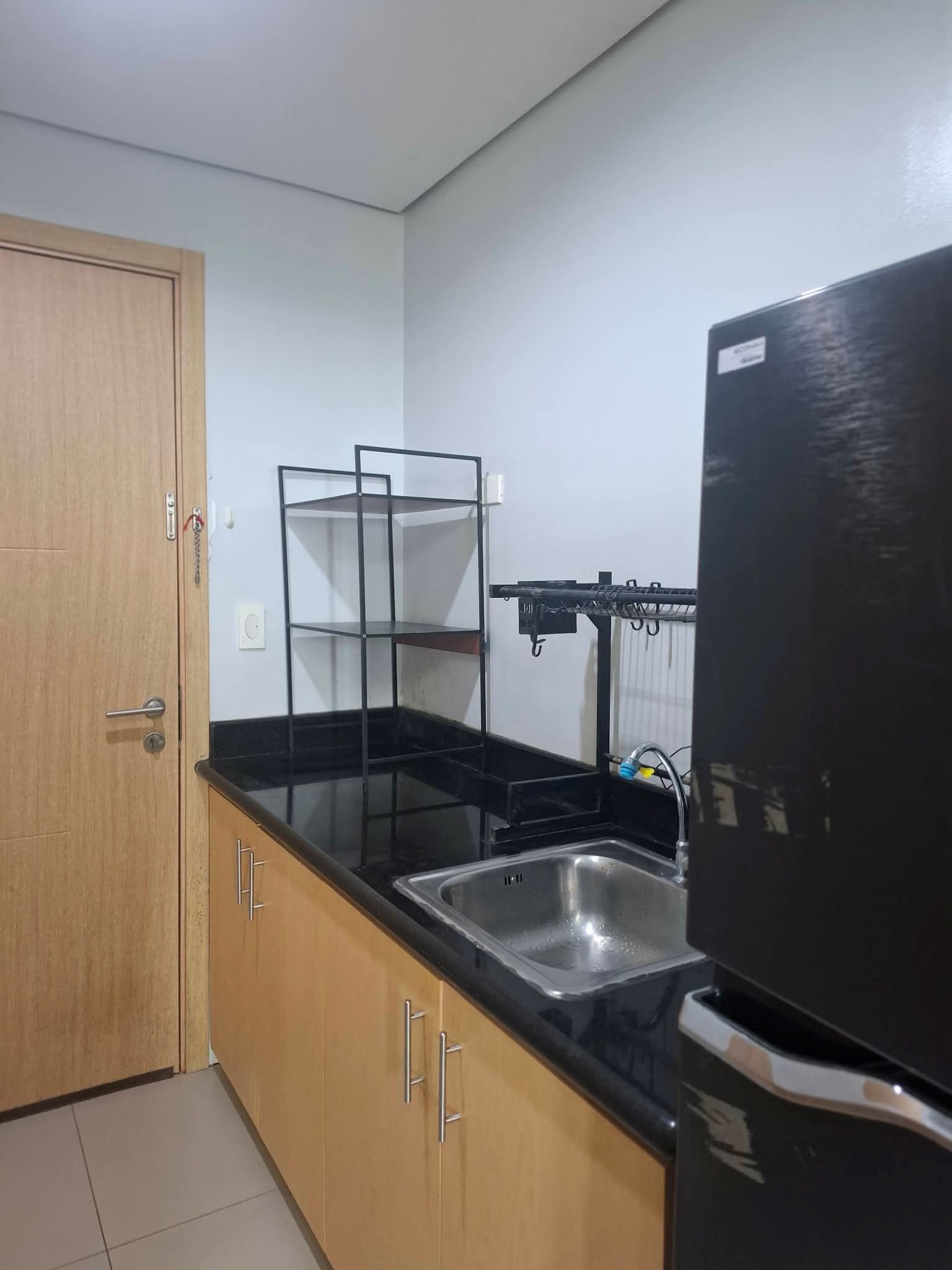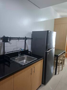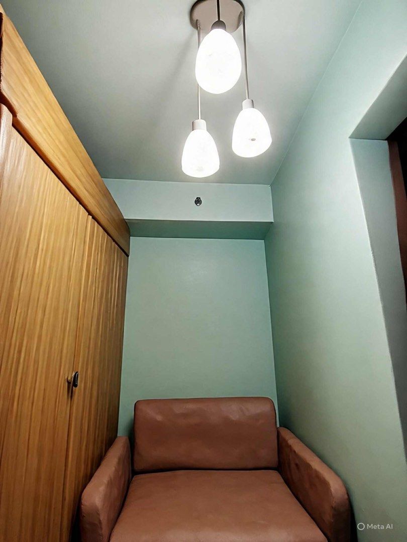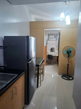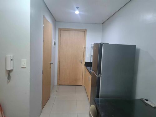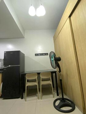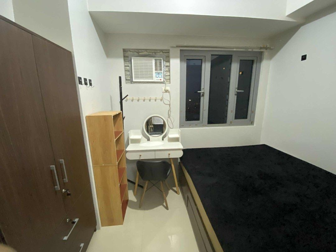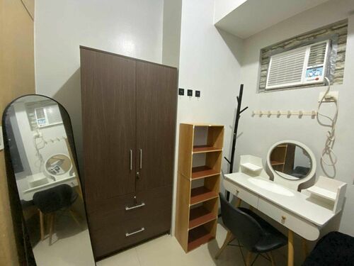 1 Bedroom facing amenities. Floor Area: 21 sqm. Fully Furnished with bed, aircon, inverter refrigerator, electric stand fan, sofa, clothes cabinet, shoe cabinet, vanity set with standing mirror, dining table, and hot shower