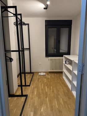The apartment has built-in wardrobes up to the ceiling, with deep and wide shelves and hanging parts: