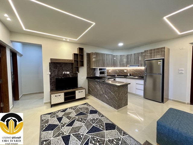 Living area with open plan kitchen leads to the balcony overlooking the Red Sea and swimming pool area, two bedrooms and the bathroom are completing this furnished apartment.