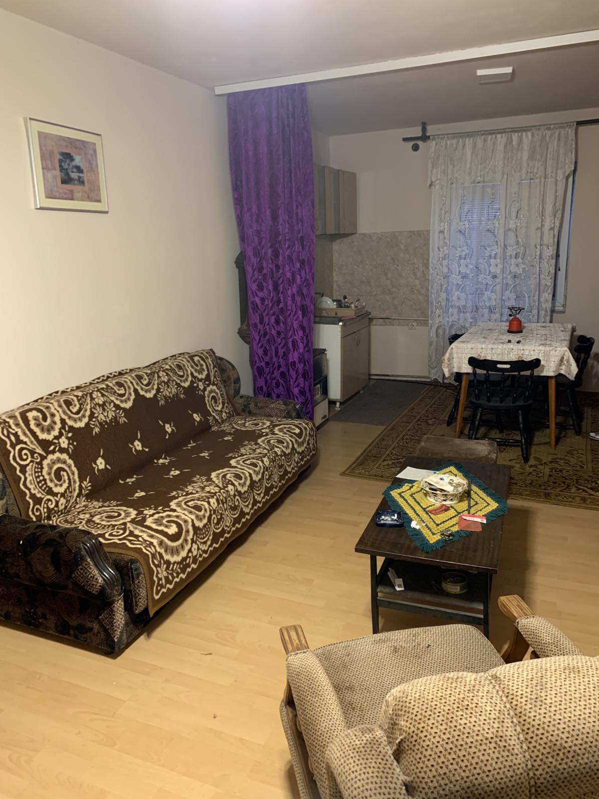 Surface area 260 square meters, 46 ares of land, the house consists of a low ground floor in which there is a large garage with a boiler room and another storage room, on the ground floor there is a bar, a living room with a kitchen and a bathroom, on the first floor two bedrooms, a living room and a bathroom, space in the attic. Immediately ready to move in, registered owner 1/1. Suitable for business activities, right next to the main road. Sold with accessories.