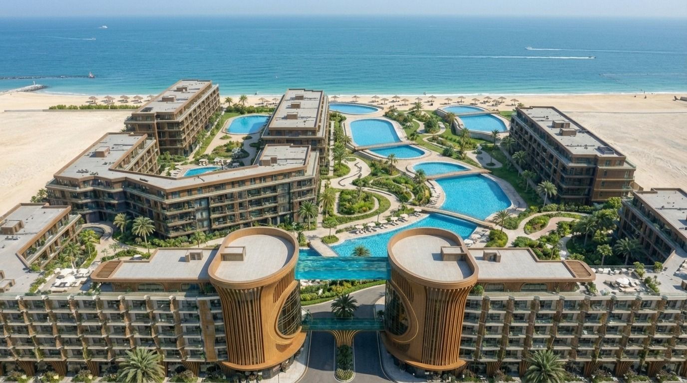 The project spans over 30,000 square meters and offers sophisticated hotel-quality amenities: infinity pools, including the unique Sky Pool—the first in Egypt—water parks for adults and children, a spa, a fitness center, restaurants, cafes, and a commercial area.