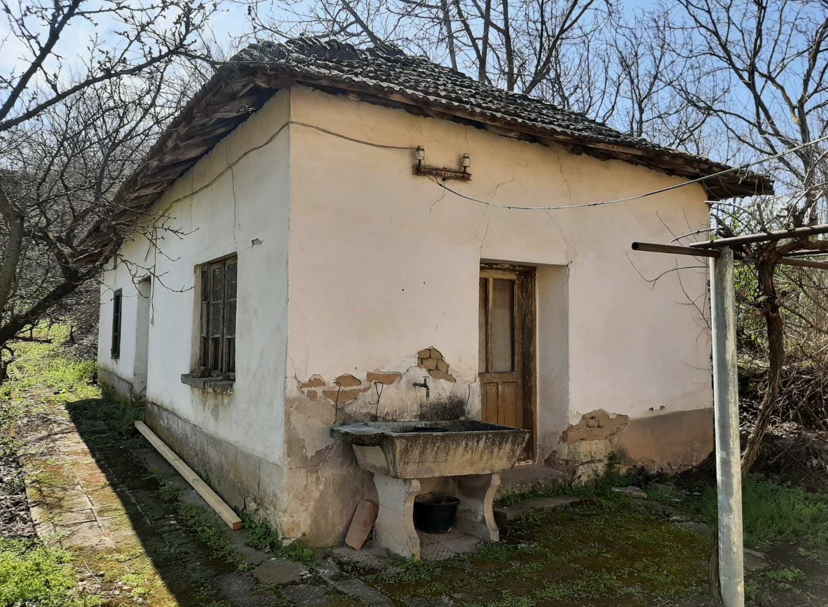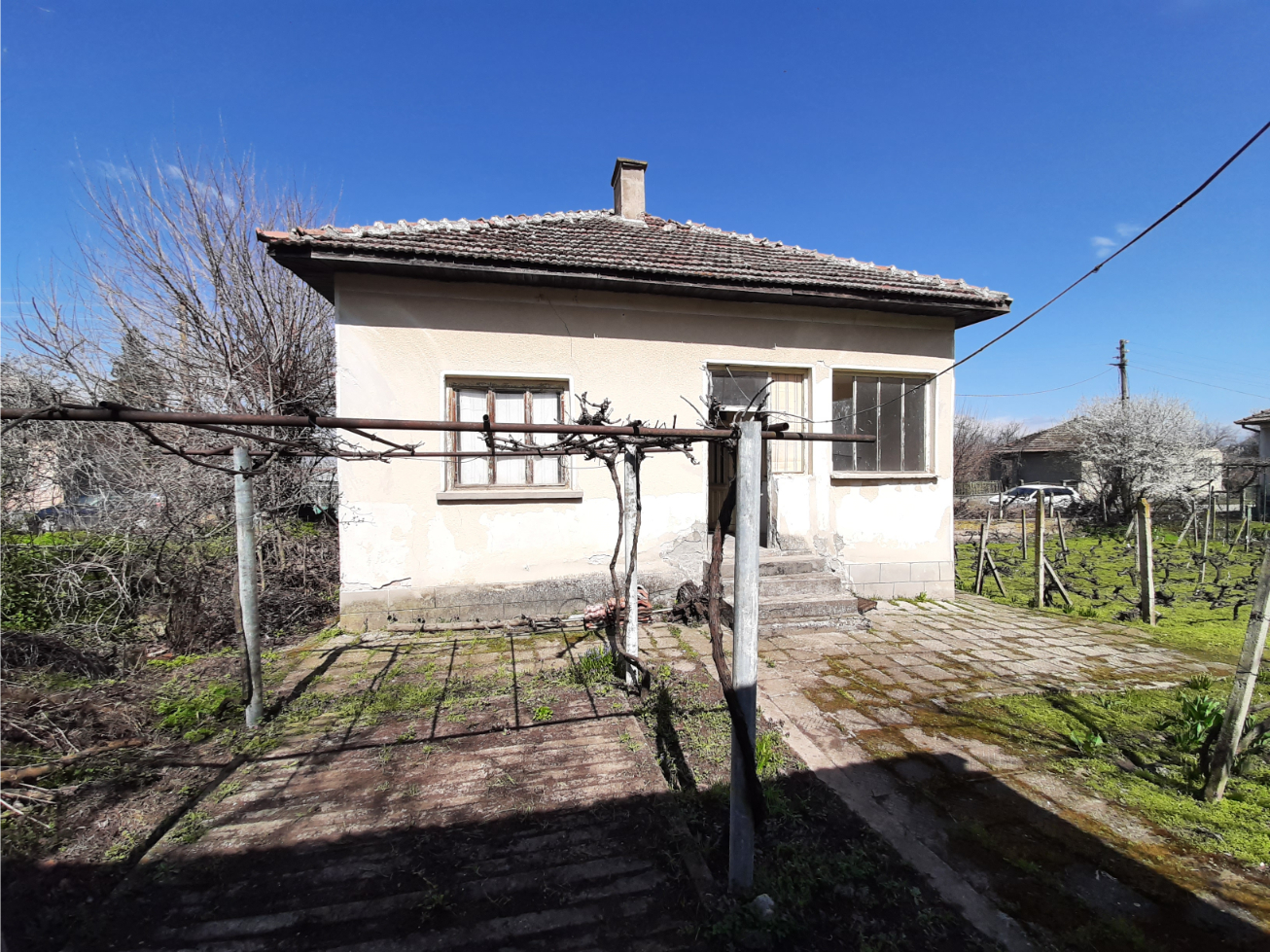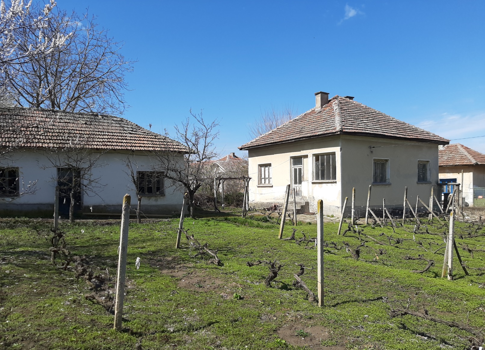 Country house with annex and plot of land situated in a quiet village on the Danube river 50 km northwest of Pleven, Bulgaria. The property is located on a quiet side street within the limits of the settlement. The house has one floor and consists of lobby, common room, spacious living room and two bedrooms. There is also a storage room with a side entrance beneath the living room. Next to the house is the annex which has three rooms – kitchen, closet and a very big storage premise at the back. The property had been empty for many years now and requires certain amount of repairs and care in order to become a nice home again. The yard is spacious and flat. It holds vineyard, several fruit trees, some flowers, strawberries and vegetables. The house is several minutes away by foot rom the river so it is an interesting option for those who like fishing and water sports. The village is situated on the banks of the Danube river about 50 km northwest of the City of Pleven, Bulgaria. Pleven is a big settlement in the Central North of Bulgaria and offers many amenities such as university, schools and kindergartens, hospitals, a wide variety of shops, supermarkets and entertainment places like restaurants, bars, discos, cinema, theater, library, museum, historical and tourist sites and much more. The city has good daily connections over road and rail with the national capital city Sofia, the Black sea coast and the City of Varna, as well as with many other cities, towns and villages in the area and across Bulgaria. Cheap rural property with quiet location and lots of potential waiting for new owners.