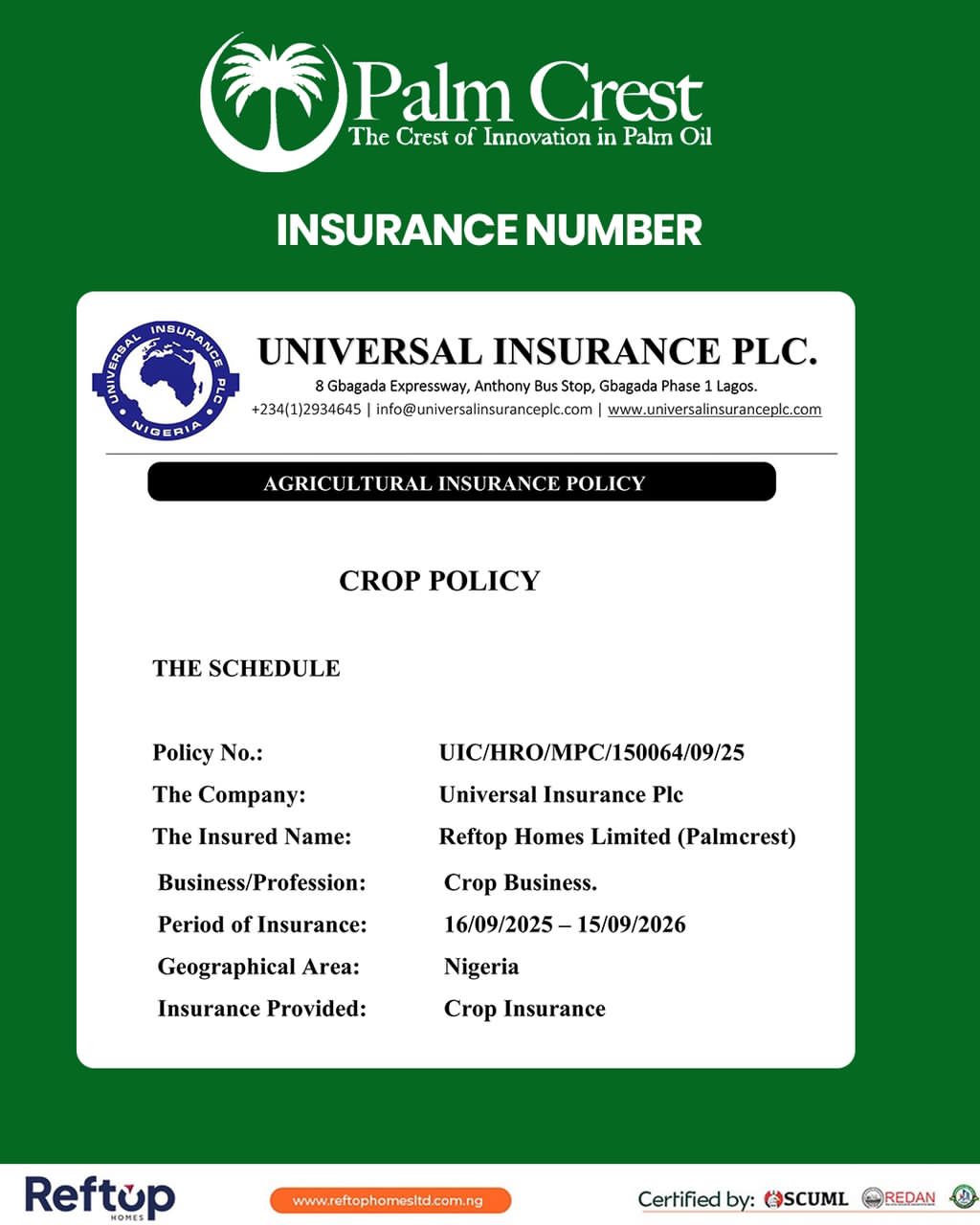 It is a pioneering development and offers a unique opportunity to own a piece of Nigeria's thriving palm oil industry without dealing with the daily operations of the farm. Contact us directly for the project brochure containing other information including the projections and timeline.