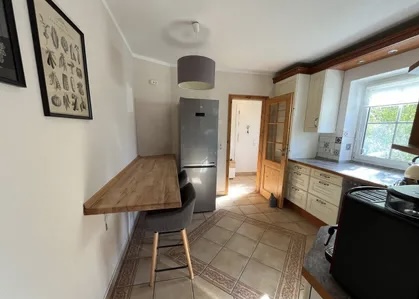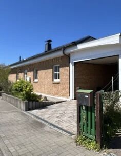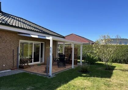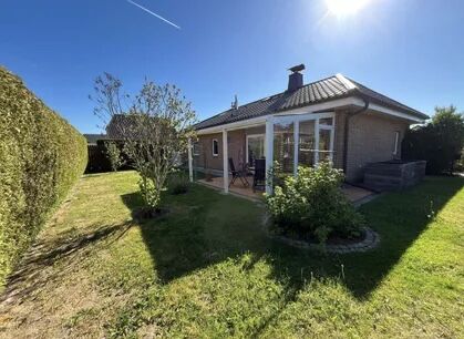 English: Detached house in bungalow style on a sunny garden plot in a very quiet location in Französisch Buchholz for rent. 4 rooms, kitchen with utility room, bathroom. Ideal for up to 5 people. Underfloor heating throughout. Fireplace with plenty of wood available. Kitchen with all built-in appliances such as washing machine, refrigerator, dishwasher, dryer on request, MW, toaster etc. Bathroom with shower, hand wash basin and whirlpool. All rooms are flooded with sunlight. Living and dining room with glazed terrace roof facing south-west.