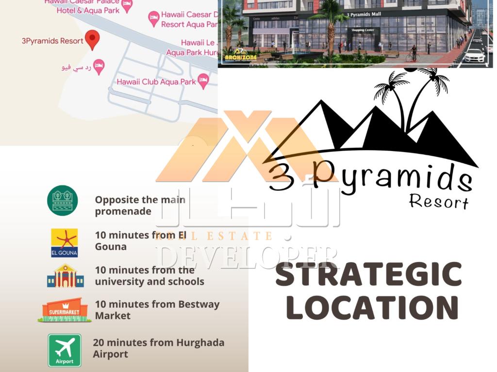 At 3 Pyramids Resort – prime location in Al Ahyaa district, directly in front of Sunrise Hotel on the Tourist Promenade, just 2nd row from the sea