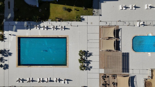 Three swimming pools surrounded by landscaped gardens