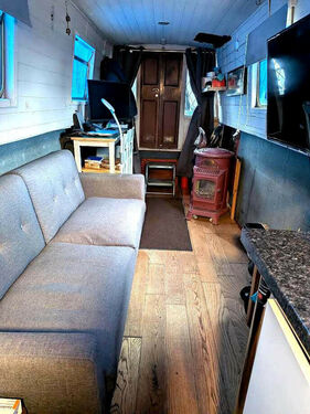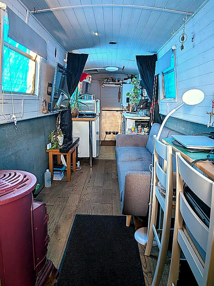Saloon: A bright and airy living space with a solid wood floor, built-in storage, and plenty of room for a log burner. Currently heated by two gas heaters, this area could easily be transformed into a warm and welcoming living area.