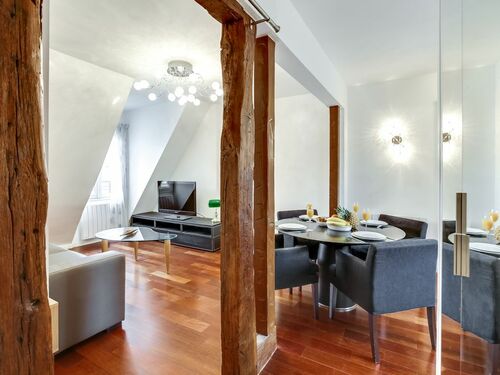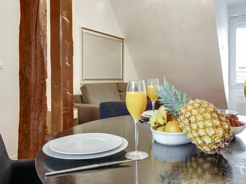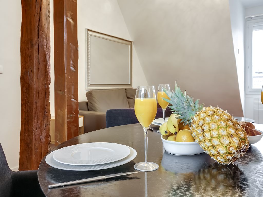 This charming apartment is located in the beautiful 7th arrondissement on the 6th floor of a secure, coded, residential apartment building without an elevator. Upon entering the apartment, you are greeted by the spacious living, kitchen and dining area. In the living area, you will find a comfortable sofa, which can be converted into a bed to accommodate an extra guest. Additional linens are provided for this bed. There is also a flat screen television with cable for your enjoyment. The flat as a unique view of the Eiffel Tower and rooftops of Paris.
