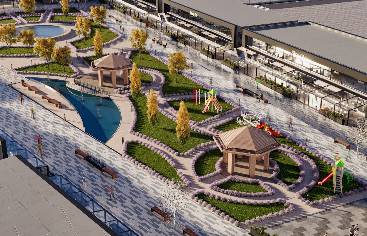 • Massive 40,000 m² commercial mall with shops, cafés, and essential services