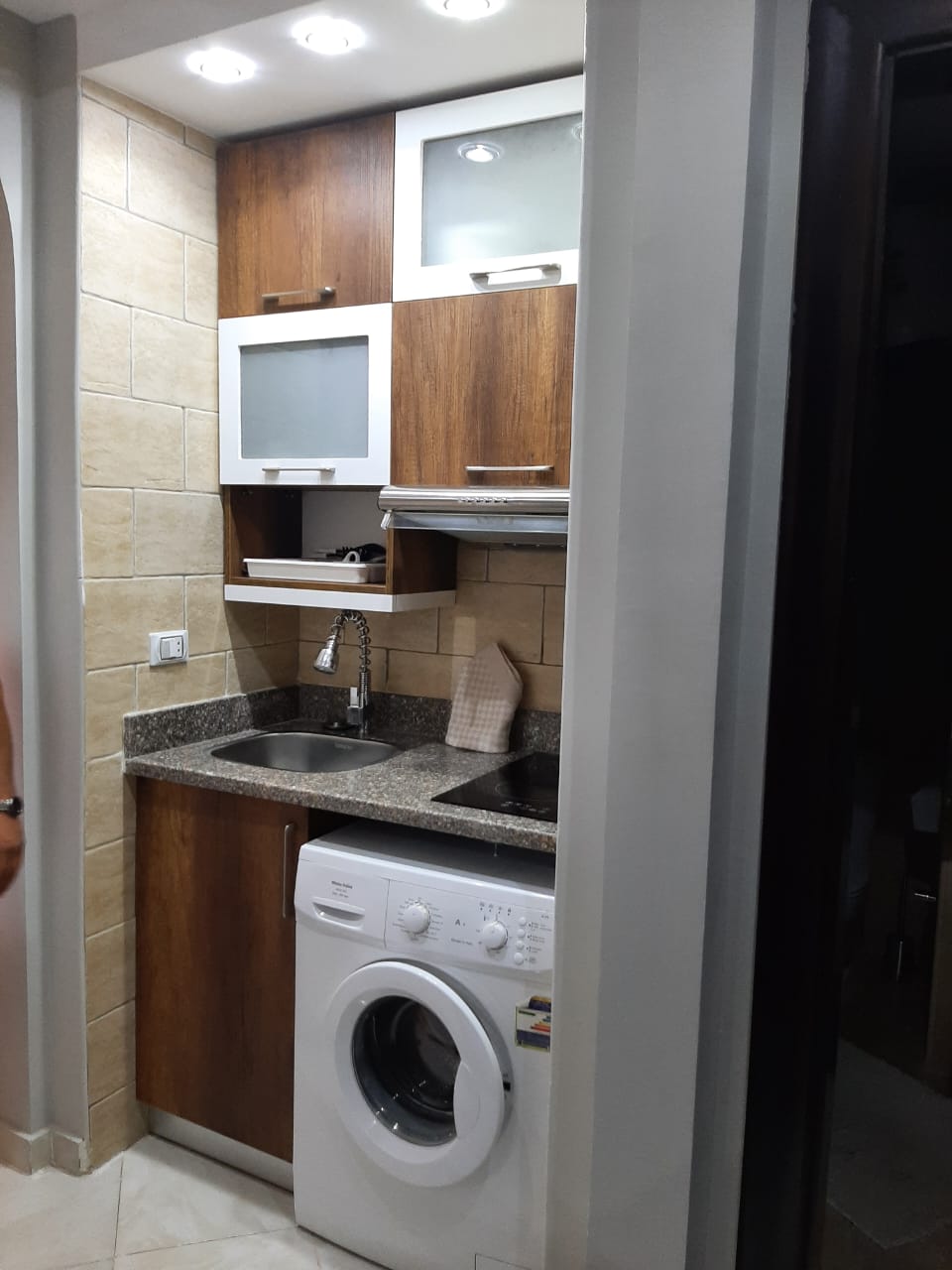 small kitchenette, bathroom and a balcony.