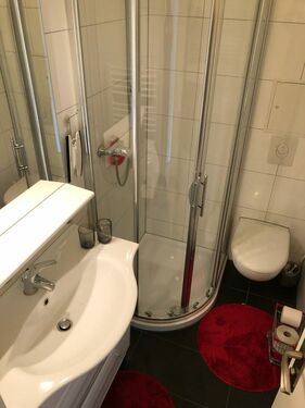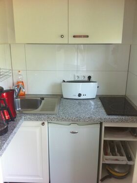 The small functional kitchen with window, fully equipped with induction hob, fridge, sink, toaster, coffee maker and kettle. Bathroom with shower, Toiltette, sink shine in a new design.